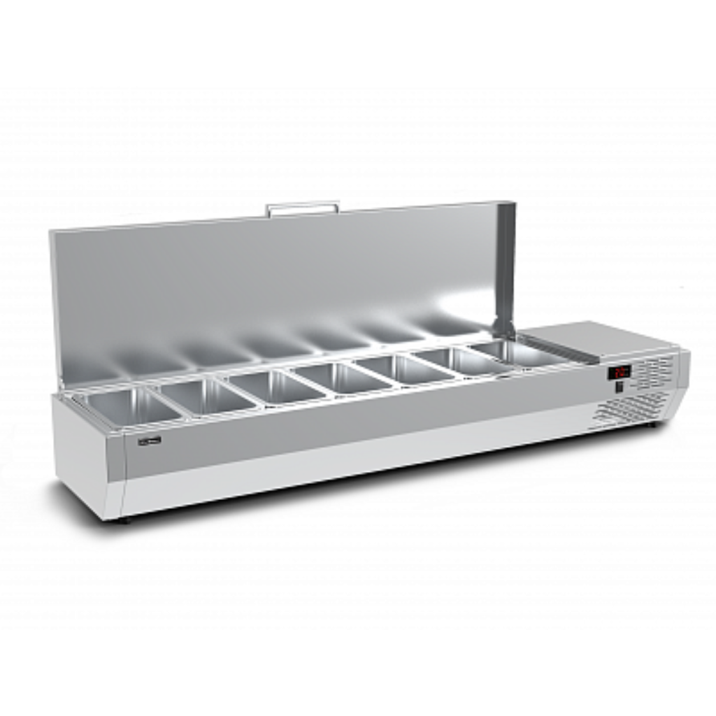Витрина для ингредиентов Carboma A30 SM 1,6 (7 GN1/4) с крышкой предназначена для охлаждения, кратковременного хранения и визуальной демонстрации ингредиентов и готовых блюд при приготовлении салатов, пиццы и других блюд. Подходит для установки на столы для пиццы, холодильные столы, барные стойки и прилавки.