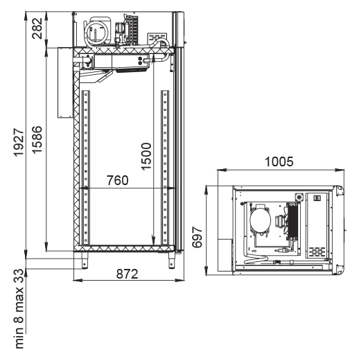 Каталог оборудования Холодильное оборудованиеШкафы холодильныеСпециализированные холодильные шкафыШкаф холодильный для вызревания салями Polair CS107 Salami со стеклом Шкаф холодильный для вызревания салями Polair CS107 Salami со стеклом Код товара: 062-631 Поделиться: WhatsAppTelegram СравнитьДобавить в КПВ избранное 0 385 050 ₽ В корзину 0 шт Под заказСамовывоз сегодня бесплатно Взять в кредит Купить в лизинг Получить консультацию в WhatsApp Описание Характеристики Отзывы 0 Инструкции 5 Шкаф холодильный для вызревания салями Polair CS107 Salami со стеклом предназначен для приготовления и хранения салями, сыровяленых колбас и других мясных деликатесов на предприятиях общественного питания и торговли. Корпус цельнозаливной конструкции выполнен из нержавеющей стали снаружи и внутри (кроме задней стенки), что обеспечивает высокую прочность и долговечность. Дверь выполнена в виде стеклопакета для удобного визуального контроля. Оборудование рассчитано на работу при температуре окружающей среды до +40 °С. Особенности: Динамическое охлаждение с мягким обдувом без заветривания Верхнее расположение агрегата Автоматическая оттайка с системой испарения конденсата Русифицированная многофункциональная панель управления с дисплеем 5" и возможностью создания и сохранения собственных программ Встроенный ультразвуковой увлажнитель (необходима подача очищенной воды и подключение к канализации) UV-лампа для обеззараживания воздуха внутри камеры 3 пары направляющих с тремя перекладинами и подвесами для колбас Регулируемый уровень влажности: от 60 до 95 % Распашная дверь с заливной теплоизоляцией, встроенной ручкой и магнитным уплотнителем Отключаемая внутренняя LED-подсветка Штампованное углубление в дне корпуса для удобства ухода Педаль для удобного открытия двери Хладагент R290 (пропан) Толщина стенки корпуса: 43 мм Polair CS107 Salami со стеклом — это профессиональный шкаф, разработанный специально для мясных деликатесов. Он обеспечивает оптимальные условия для ферментации и хранения продукции за счёт точного контроля температуры и влажности, продуманной конструкции и удобного функционала. Такой шкаф станет надёжным решением для мясных цехов, гастробаров и специализированных магазинов.Изображение товара, представленного на фото, может отличаться от его фактического вида. Показать все Габаритные размеры697×1005×1960 ммДиапазон рабочей температурыот -2 до +30 °CДлина697 ммШирина1005 ммВысота1960 ммОбъём700 лКол-во дверей1 Тип двериСтеклянная Уровень влажностиот 60 до 95 %Холодильный агрегатВстроенный Тип оттайкиАвтоматическая Тип охлажденияДинамическое ПодсветкаЕсть UV-лампаЕсть ХладагентR290 Вес нетто160 кгВес брутто190 кгБрендPolairВсе специализированные холодильные шкафы Из нержавейкиВсе специализированные холодильные шкафы Стеклянная дверь Оставить отзыв Еще никто не оставил отзыв на этот товар Схема POLAIR CS107 Salami.jpgИнструкция на POLAIR CS107 Salami.pdfБрошюра на POLAIR CS107 Salami.pdfДекларация о соответствии.pdfСертификат соответствия.pdf Похожие товары Перейти в каталог В наличии 403 670 ₽ Шкаф холодильный для хлебопекарных производств Polair CS107 Bakery Br (Тип 2) Под заказ 252 314 ₽ Шкаф холодильный для вызревания мяса и сыра Carboma M700GN-1-G-MHC 9005 Под заказ 397 800 ₽ Шкаф холодильный для вызревания сыра Polair CS107 Cheese полки нерж., со стеклом Под заказ 282 471 ₽ Шкаф холодильный для вызревания мяса и сыра Carboma M700GN-1-G-MHC 0430 Под зак
