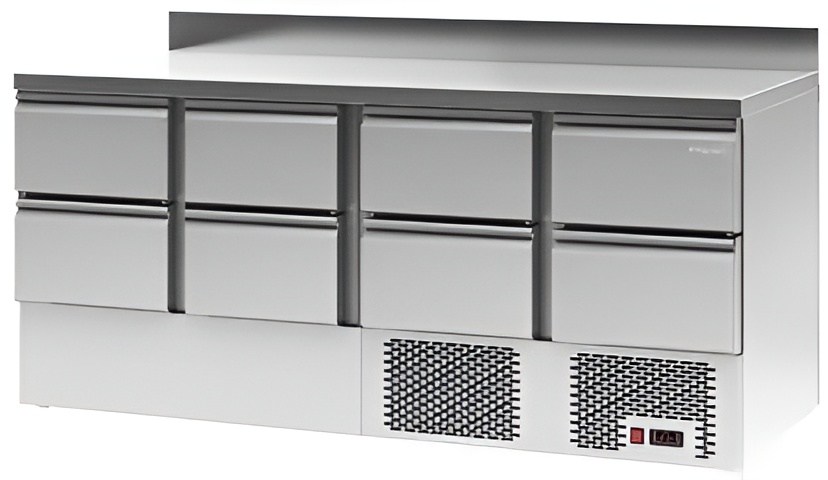 Каталог оборудования Холодильное оборудованиеСтолы охлаждаемыеСтолы холодильные среднетемпературныеСтол холодильный среднетемпературный Polair TMi4GN-2222-G Стол холодильный среднетемпературный Polair TMi4GN-2222-G Код товара: 062-578 Поделиться: WhatsAppTelegram СравнитьДобавить в КПВ избранное 0 265 574 ₽ В корзину 0 шт Под заказСамовывоз сегодня бесплатно Взять в кредит Купить в лизинг Получить консультацию в WhatsApp Описание Характеристики Отзывы 0 Стол холодильный среднетемпературный Polair TMi4GN-2222-G предназначен для хранения продуктов и подготовки ингредиентов на рабочей поверхности на предприятиях общественного питания и торговли. Цельнозаливные корпус и двери изготовлены из прочной стали, что обеспечивает высокую механическую прочность, надежную термоизоляцию, герметичность и долгий срок службы. Оборудование рассчитано на эксплуатацию при температуре окружающей среды до +43 °С и относительной влажности до 80%, что делает его отличным решением для профессиональных кухонь. Особенности: Электронный терморегулятор для точного и стабильного поддержания температуры; Класс защиты IP24, подходящий для работы в условиях повышенной влажности; Регулируемые по высоте ножки для удобства установки и устойчивости; Толщина столешницы — 40 мм, обеспечивающая прочность и устойчивость к нагрузкам; Толщина стенок корпуса — 43 мм для отличной теплоизоляции и долговечности; Тип полок: Gastronorm GN 1/1, удобный для использования стандартной гастроемкости; Оснащен 8 выдвижными ящиками, что значительно упрощает организацию хранения продуктов и обеспечивает быстрый доступ к ингредиентам. Polair TMi4GN-2222-G — это функциональный и надежный холодильный стол, который сочетает продуманную конструкцию с высокой вместимостью и удобством эксплуатации. Наличие восьми ящиков делает его особенно удобным для интенсивной работы на профессиональной кухне, где требуется быстрое и удобное хранение большого количества ингредиентов.Изображение товара, представленного на фото, может отличаться от его фактического вида. Показать все Габаритные размеры1850×700×910 ммДиапазон рабочей температурыот -2 до +10 °CРасположение агрегатаНижнее Материал столешницыНержавеющая Тип столаС ящиками Объём368 лКоличество ящиков8 штНапряжение220 ВМощность0,35 кВтТип охлажденияДинамическое Тип оттайкиАвтоматическая ХладагентR290 СтолешницаС бортом Габариты в упаковке2165×815×1045 ммВес нетто165 кгВес брутто200 кгБрендPolairВсе холодильные столы PolairВсе нержавеющие холодильные столы Все холодильные столы с бортом Оставить отзыв Еще никто не оставил отзыв на этот товар Ранее просмотрено Под заказ 19 454 ₽ Ванна моечная МХМ М-1-0,4-0,53/1,01 нерж. Под заказ 148 824 ₽ Стол холодильный среднетемпературный Polair TMi2GN-22G без борта Под заказ 152 460 ₽ Стол морозильный Carboma T70 L3-1 9006 (3GN/LT Полюс) с бортом В наличии 157 745 ₽ Плита индукционная Tatra TIR.87M (серия 700) Под заказ 121 600 ₽ Откатная холодильная дверь Север НТ-ОХД 1200*3000/80 Под заказ 553 358 ₽ Льдогенератор чешуйчатого льда Abat ЛГ-620Ч-02 воздушное охлаждение В наличии 75 570 ₽ Шкаф холодильный МХМ Капри П-490С (контроллер)
