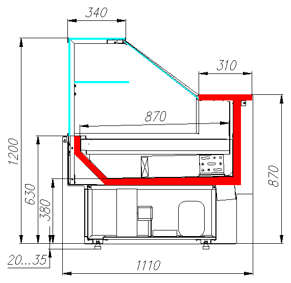 Конструкция оснащена регулируемыми ножками (20–35 мм), что позволяет устанавливать витрину даже на неровных поверхностях. Рабочая поверхность и столешница выполнены из шлифованной нержавеющей стали, передняя панель — из окрашенной серой стали, боковины — из пластика, что обеспечивает прочность и аккуратный внешний вид.